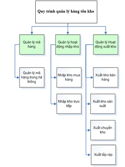 Quy trình bao gồm 3 công việc chính: Quản lý mã hàng, Quản lý hoạt động nhập kho, Quản lý hoạt động xuất kho.