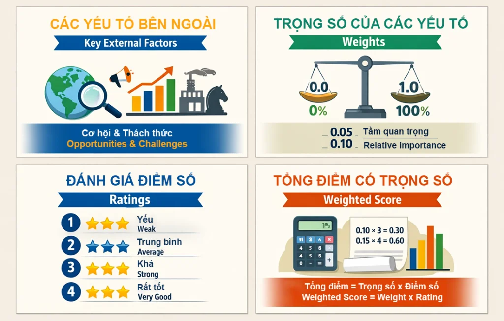 Đối với từng yếu tố sẽ được đánh giá bằng số điểm cụ thể. Trọng số đó sẽ phản ánh mức độ quan trọng tương đối của từng yếu tố bên ngoài đối với sự thành công của doanh nghiệp. Mỗi yếu tố sẽ được gán một trọng số từ 0 đến 1, trong đó 0 sẽ là trọng số ít quan trọng và 1 sẽ là số có tầm quan trọng.