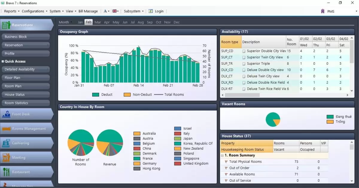 Với những tính năng nổi bật như: Khả năng kiểm tra, phát hiện lỗi logic của dữ liệu, cung cấp các cảnh báo về tình trạng phòng, biểu đồ công suất phòng; Kết nối dữ liệu chặt chẽ giữa các phòng ban; Khả năng kết nối với các thiết bị khác như điện thoại, máy chấm công, chìa khóa từ…; Quản trị, truy xuất dữ liệu đa chiều; Chức năng kiểm toán đêm thông minh giúp cho việc quản lý phòng trở nên đơn giản, tiết kiệm nhiều thời gian, công sức.