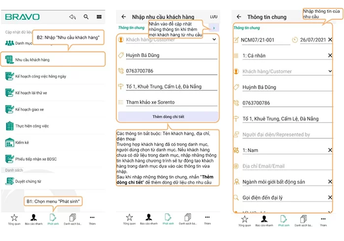 Tư vấn bán hàng (TVBH) tiếp nhận thông tin nhu cầu từ khách hàng và cập nhật thông tin “Nhu cầu khách hàng” vào phần mềm hoặc thông qua ứng dụng BRAVO Apps.