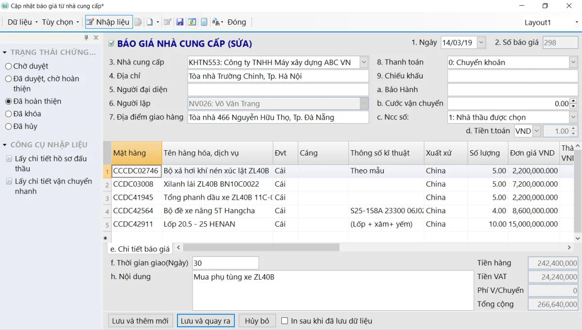 - Tiến hành cập nhật “Báo giá nhà cung cấp” trên phần mềm để theo dõi và thực hiện so sánh.