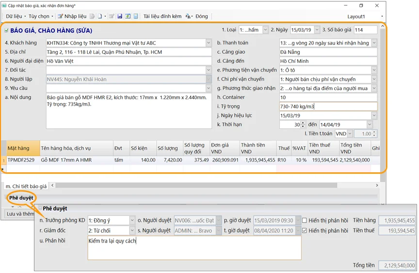 - Từ yêu cầu của khách hàng, BP. Kinh doanh tiến hành báo giá (dựa vào giá trị, định mức giá).