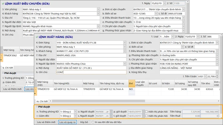- Nếu “Lệnh xuất hàng” và “Lệnh điều chuyển” được thông qua, thông tin sẽ chuyển trực tiếp để Kho thành phẩm chuẩn bị xuất hàng.