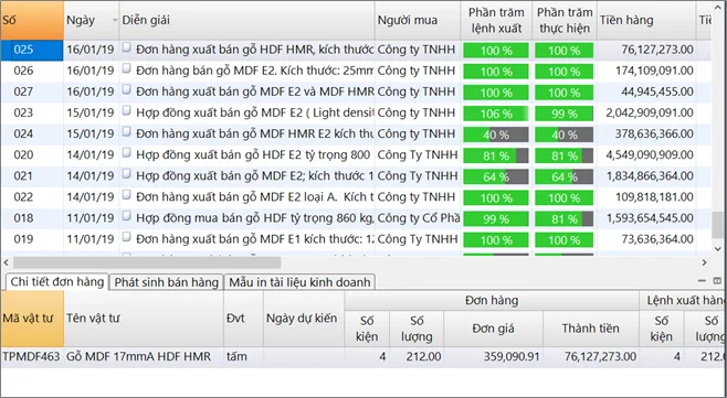 - Thực hiện theo dõi tiến độ giao hàng và tiến độ thực hiện đơn hàng: hiển thị bằng % hoàn thành
