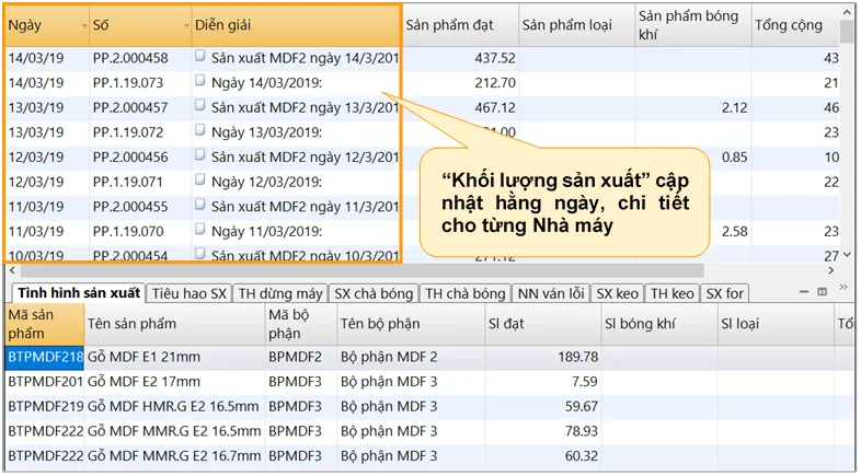 - “Khối lượng sản xuất” được cập nhật hàng ngày, chi tiết cho từng Nhà máy sản xuất là dữ liệu để phục vụ cho các báo cáo - thống kê về tình hình sản xuất, đồng thời cũng là dữ liệu để so sánh về tiêu hao nguyên vật liệu giữa định mức với phát sinh thực tế: