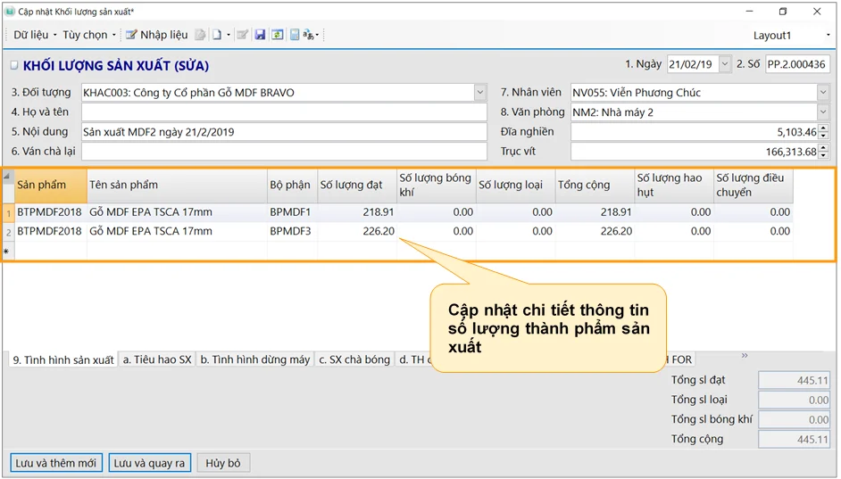 - Tab “Sản xuất keo”: Cập nhật chi tiết thông tin số lượng sản xuất keo