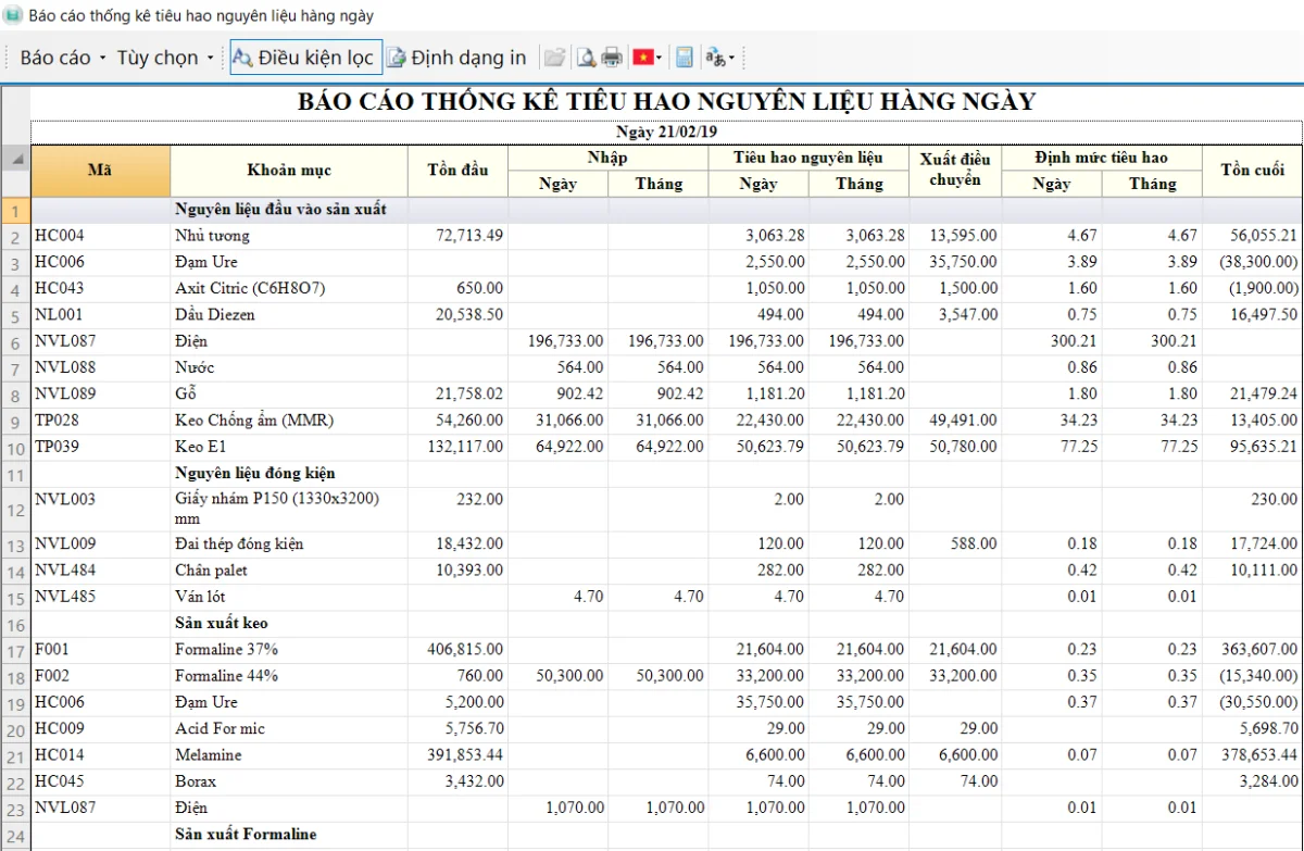 Báo cáo Thống kê tiêu hao nguyên liệu hằng ngày