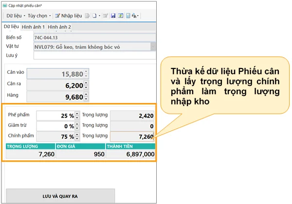 - Người dùng đánh giá chất lượng gỗ thu mua và xác định được % phế phẩm hoặc % giảm trừ (chọn 1 trong 2 chỉ tiêu phế phẩm hoặc giảm trừ), chương trình phần mềm sẽ tự xác định % chính phẩm đồng thời tự động tính trọng lượng phế phẩm (hoặc trọng lượng giảm trừ) và trọng lượng chính phẩm.