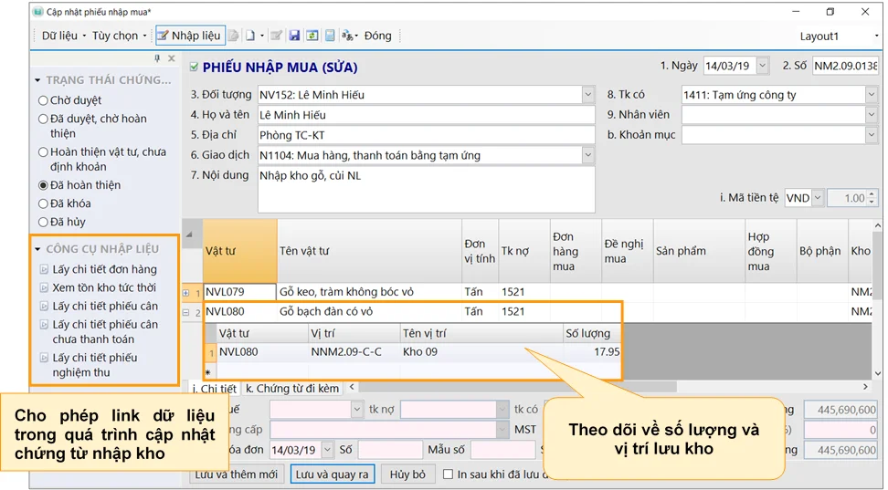 - Chủ động trong công tác nhập/ xuất kho do sự liên kết và kế thừa dữ liệu trực tiếp trên phần mềm.