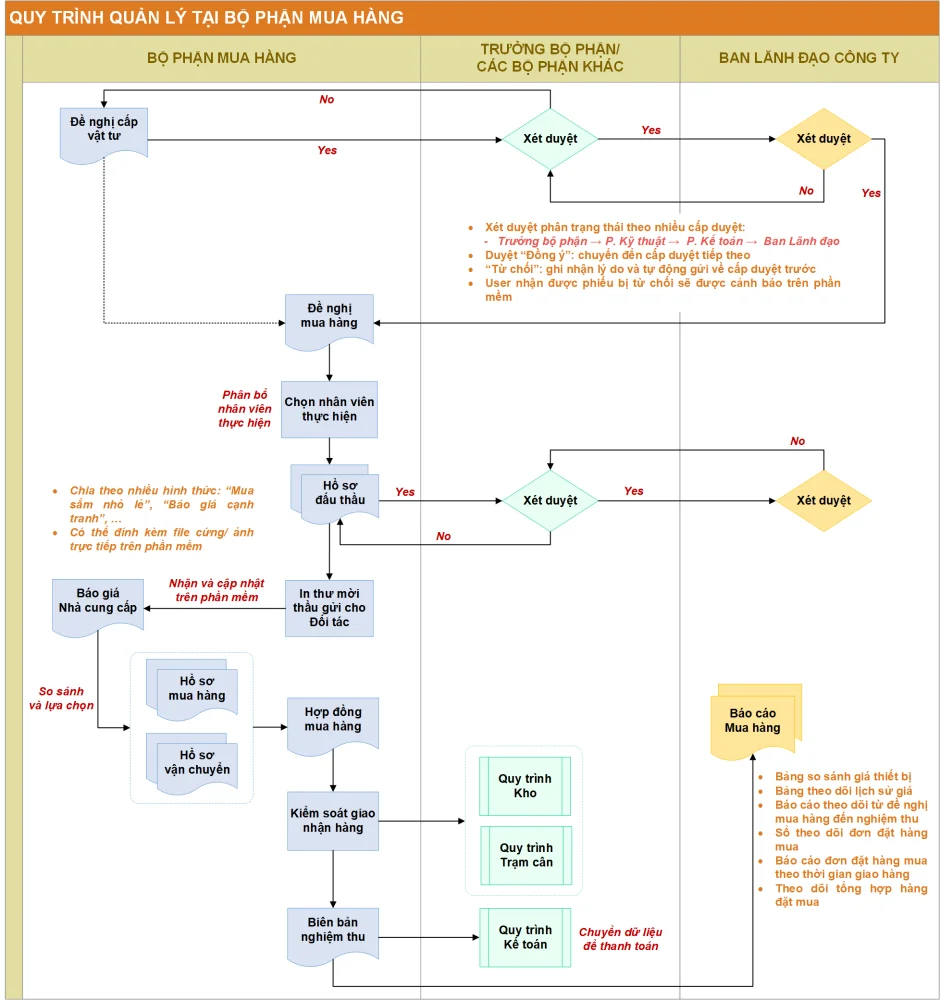- Công tác quản lý hoạt động mua hàng bao gồm quản lý cân đối, xét duyệt - nhập mua vật tư, CCDC, nguyên liệu… phục vụ cho hoạt động kinh doanh sản xuất diễn ra hằng ngày tại Doanh nghiệp.