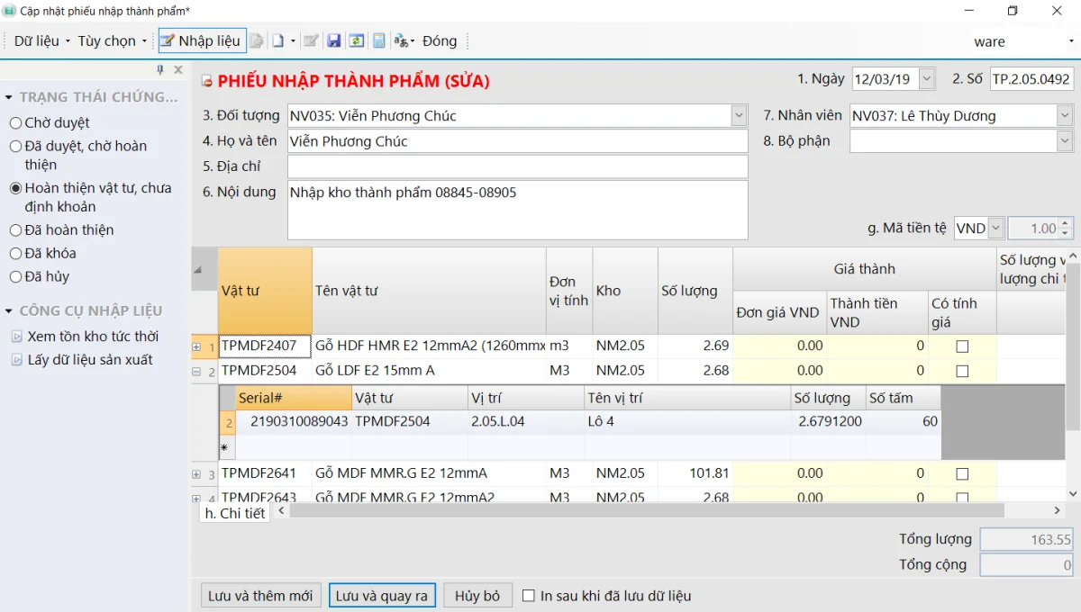 - Thông tin theo dõi chi tiết “Phiếu nhập thành phẩm”: loại thành phẩm nhập kho, chi tiết số lượng nhập kho của từng thành phẩm, mã kiện hàng - mã vạch sản xuất, vị trí lưu kho.