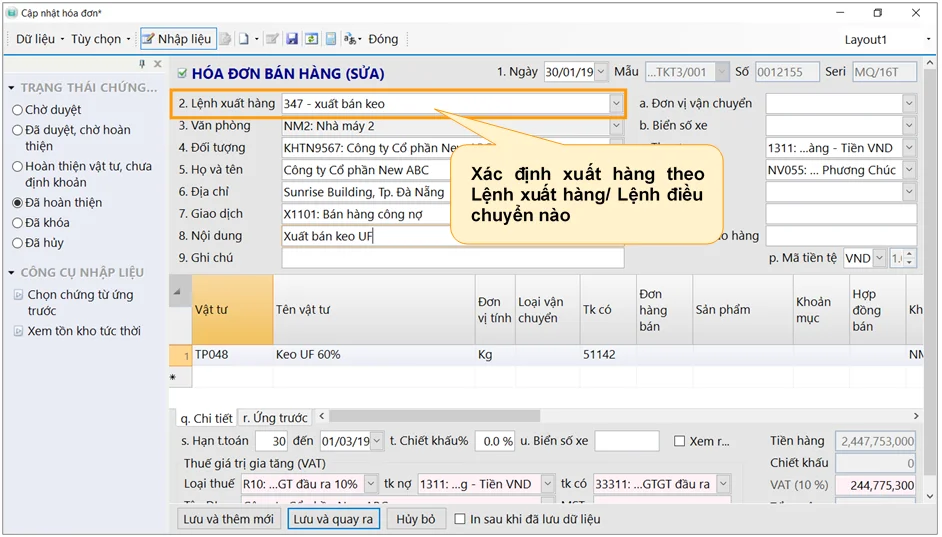 - Khi thực hiện xuất hàng đi bán, Kho Thành phẩm sẽ cập nhật chứng từ xuất thành phẩm, trên từng chứng từ xuất thành phẩm sẽ xác định chính xác xuất theo Lệnh xuất hàng/ Lệnh điều chuyển nào.