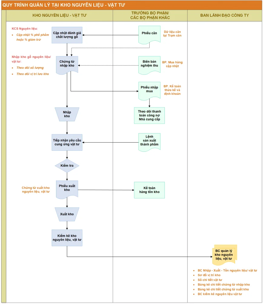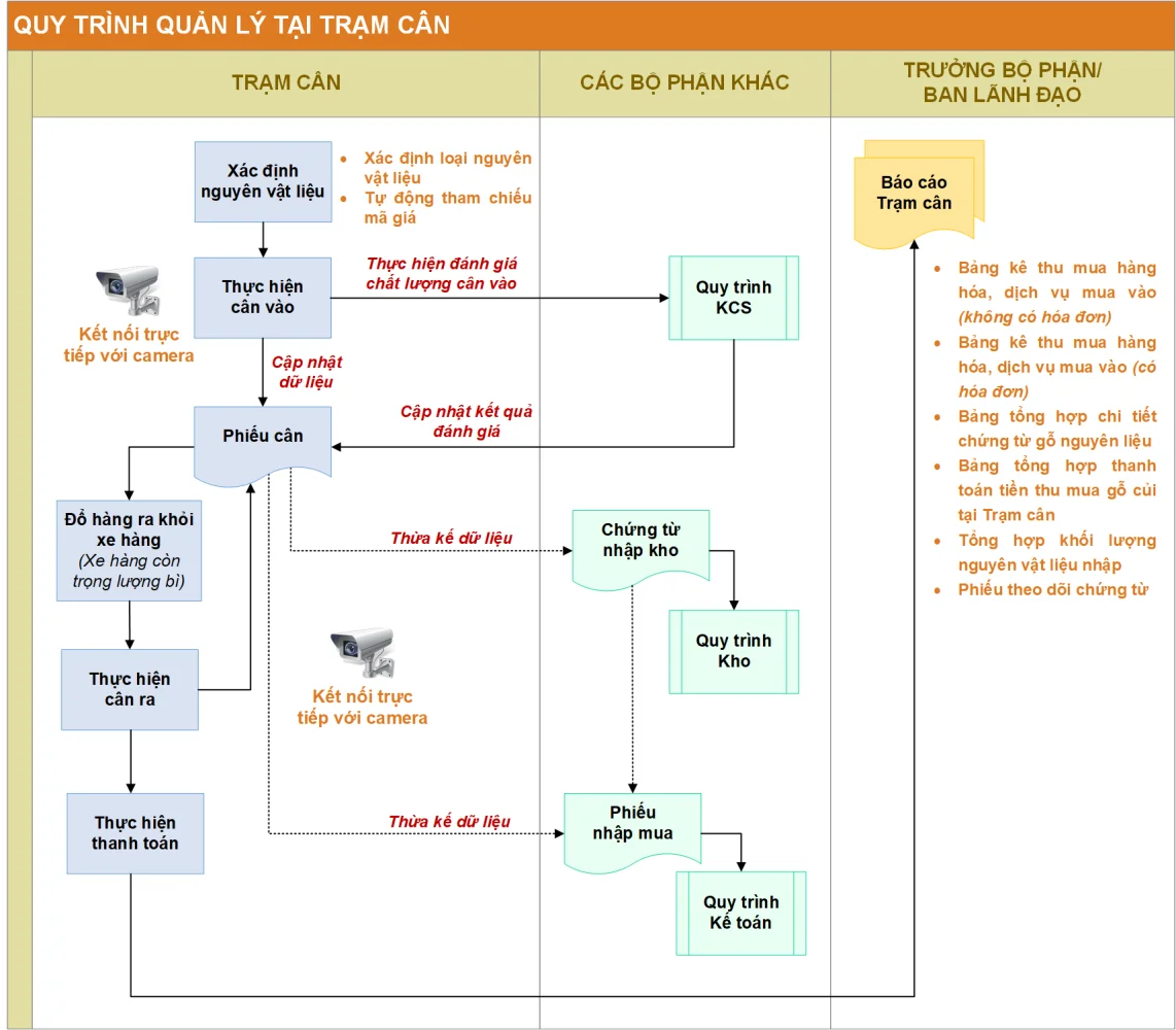 - Đối với nguyên liệu gỗ mua về để phục vụ sản xuất, Kho vật tư sẽ thừa kế dữ liệu “Phiếu cân” (thực hiện tại Trạm cân) làm căn cứ cho trọng lượng thu mua. Đồng thời sẽ tiến hành KCS nguyên liệu để đánh giá chính xác mức độ tạp chất/ chính phẩm nhằm kiểm soát chi phí thu mua nguyên vật liệu của Doanh nghiệp.