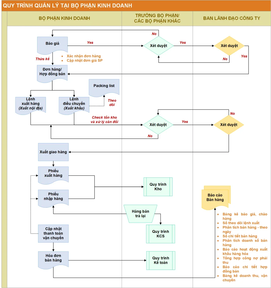 - Công tác quản lý Kinh doanh bán hàng được thực hiện ngay từ bước Tiếp nhận yêu cầu → Gửi báo giá Khách hàng, cho đến khi Bp. Kinh doanh cập nhật “Lệnh xuất hàng” (đối với các đơn hàng nội địa) hoặc “Lệnh điều chuyển” (đối với các đơn hàng xuất khẩu) và hoàn tất việc giao hàng cho Khách hàng.