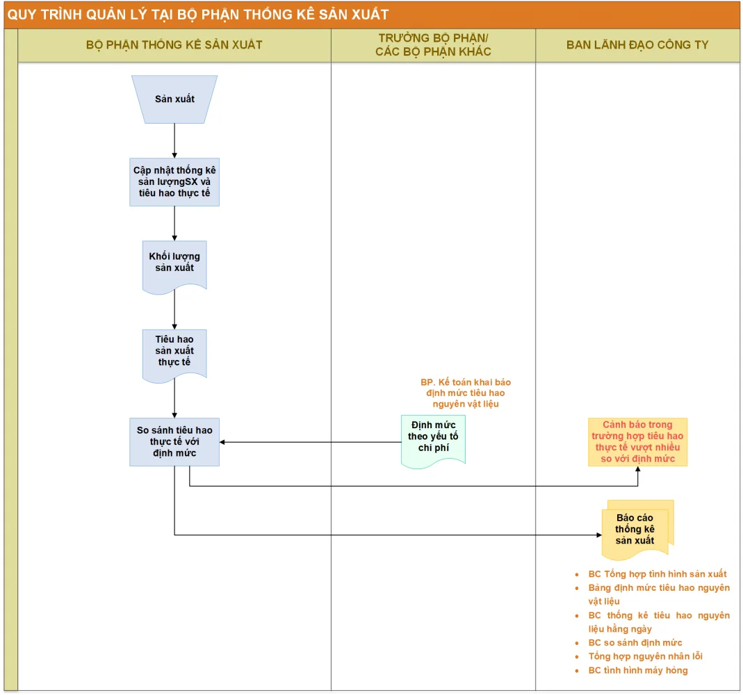 - Đồng thời sẽ căn cứ vào số liệu thống kê nguyên liệu tiêu hao thực tế để so sánh giữa định mức và thực tế → đưa ra cảnh báo trong trường hợp nếu thực tế nguyên vật liệu sử dụng vượt nhiều so với định mức.