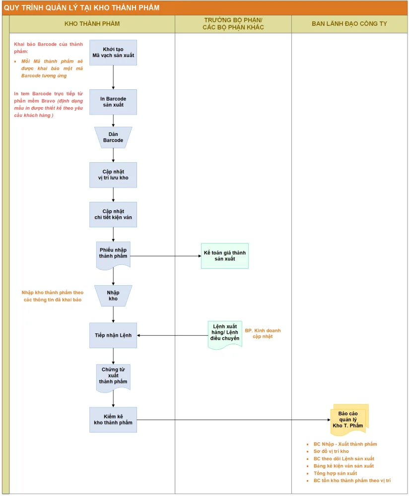 - Kho Thành phẩm sẽ theo dõi “Lệnh xuất hàng” (đối với trường hợp bán hàng nội địa) hoặc “Lệnh điều chuyển” (đối với trường hợp bán hàng xuất khẩu) để thực hiện xuất thành phẩm đi bán.