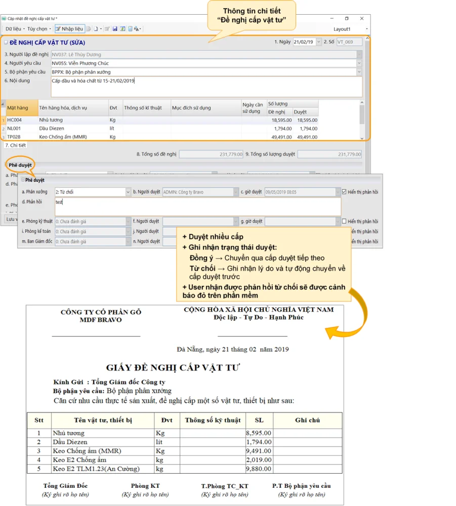 - Để hỗ trợ tính linh động trong công tác xét duyệt “Đề nghị cấp vật tư”, “Đề nghị mua hàng” và việc xét duyệt các Đề nghị/ Đơn hàng được thực hiện trên App BRAVO. ==>Thực hiện xét duyệt qua nhiều cấp duyệt, đồng thời cập nhật phản hồi “Đồng ý”/ “Từ chối” kèm theo lý do cụ thể để công tác mua hàng được quản lý một cách chặt chẽ và rõ ràng.