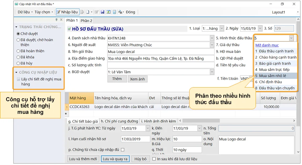 - Nhân viên mua hàng thực hiện cập nhật “Hồ sơ đấu thầu” được phân thành nhiều hình thức và các mẫu in đính kèm sẽ được thiết kế form mẫu tùy theo từng hình thức.