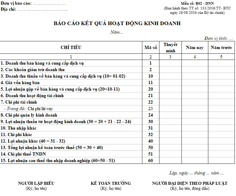 2. Các mẫu Báo cáo kết quả kinh doanh