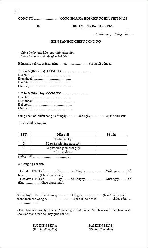 Mẫu biên bản đối chiếu công nợ mới nhất theo quy định ban hành