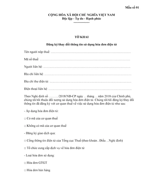 Mẫu số 01: Tờ khai đăng ký/ thay đổi thông tin sử dụng HĐĐT
