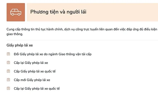 Tại giao diện chính, bạn hãy chọn vào mục Phương tiện và người lái - Giấy phép lái xe - Đổi Giấy phép lái xe do ngành giao thông vận tải cấp. Tiếp theo, bạn hãy chọn cơ quan thực hiện là Sở GTVT của tỉnh/thành phố hoặc chọn trực tiếp bộ, ngành.