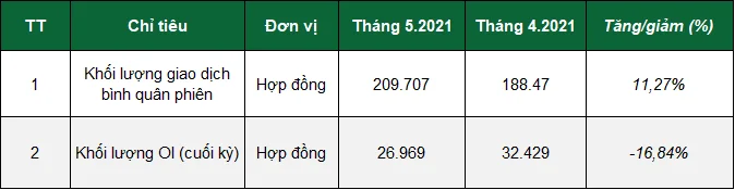 Khối lượng hợp đồng mở (OI) tại phiên giao dịch cuối tháng 5 đạt 26.969 hợp đồng, so với tháng trước giảm 16,84%. Mức OI cao nhất trong tháng 5 là phiên giao dịch ngày 10/5/2021, đạt 37.471 hợp đồng tại phiên giao dịch. Riêng giao dịch hợp đồng tương lai trái phiếu Chính phủ không phát sinh trong tháng 5/2021.