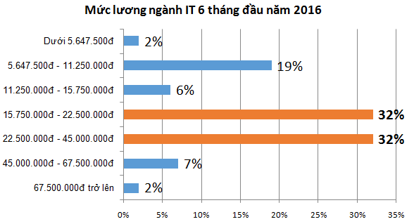 Trong khi mức lương phổ biến của các ngành nghề được đánh giá là ngành nóng bao gồm Kế toán, Hành chính, Sản xuất, Marketing, Sales là vào khoảng 5,6 triệu đồng – 11,25 triệu đồng/tháng thì ngành Công nghệ thông tin có mức lương phổ biến từ 15,7 triệu đồng – 22,5 triệu đồng và từ 22,5 triệu đồng – 45 triệu đồng/tháng.