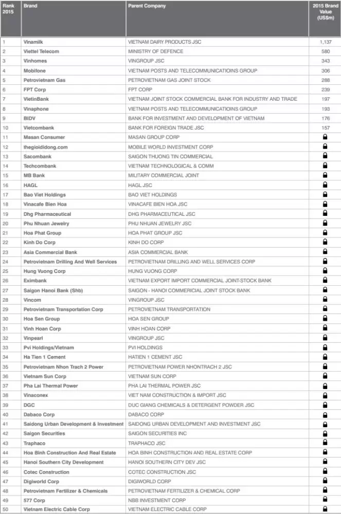 Xem chi tiết Top 50 thương hiệu có giá trị nhất Việt Nam: